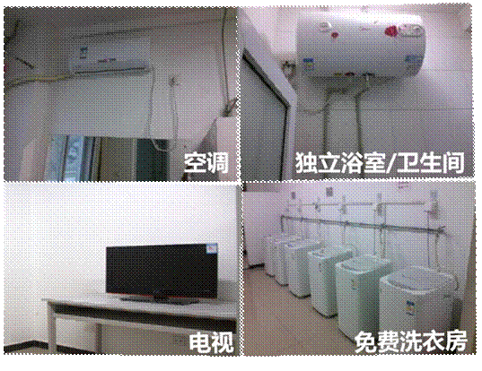 四人间,配有空调、暖气、32寸液晶电视、衣柜、桌椅、网络、洗衣机等设施,并有完善的生活区物业管理。