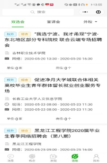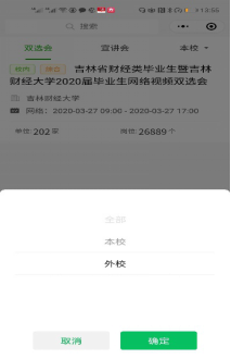 2. 非主办方(其他学校):进入双选会频道后,请点击右上方“本校-外校”,点击确定,切换至外校双选会,点击本场双选会入场参会。
