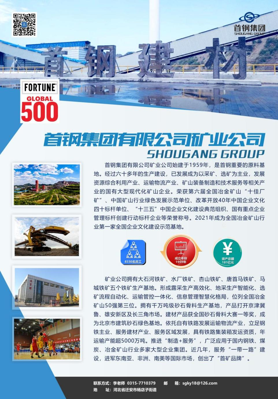 首钢集团有限公司矿业公司始建于1959年,是首钢重要的原料基地。经过六十多年的生产建设,已发展成为以采矿、选矿为主业,发展资源综合利用产业、运输物流产业、矿山装备制造和技术服务等相关产业的国有大型现代化矿山企业。荣获第六届全国冶金矿山“十佳厂矿”、中国矿山行业绿色发展示范单位、改革开放40年中国企业文化四十标杆单位、“十三五”中国企业文化建设典范组织、国有重点企业管理标杆创建行动标杆企业等荣誉称号。2021年成为全国冶金矿山行业第一家全国企业文化建设示范基地。矿业公司拥有大石河铁矿、水厂铁矿、杏山铁矿、唐首马铁矿、马城铁矿五个铁矿生产基地,位列全国冶金矿山50强第三位。践行“绿水青山就是金山银山”的绿色发展理念,发展资源综合利用产业,建材产品获全国砂石骨料大赛一等奖,成为北京市建筑砂石绿色基地。依托自有铁路发展运输物流产业,立足钢铁主业、服务建材产业、服务区域发展,具有铁路集装箱发运资质,年运输产能超5000万吨。推进“制造+服务”,相关产业涉及自动化、信息化、工程建设、装备制造、电力修造、设备维检等6大领域,广泛应用于国内钢铁、煤炭、冶金矿山行业多家大型企业集团,服务“一带一路”建设,进军东南亚、非洲、南美等国际市场,创出了“首矿品牌”。